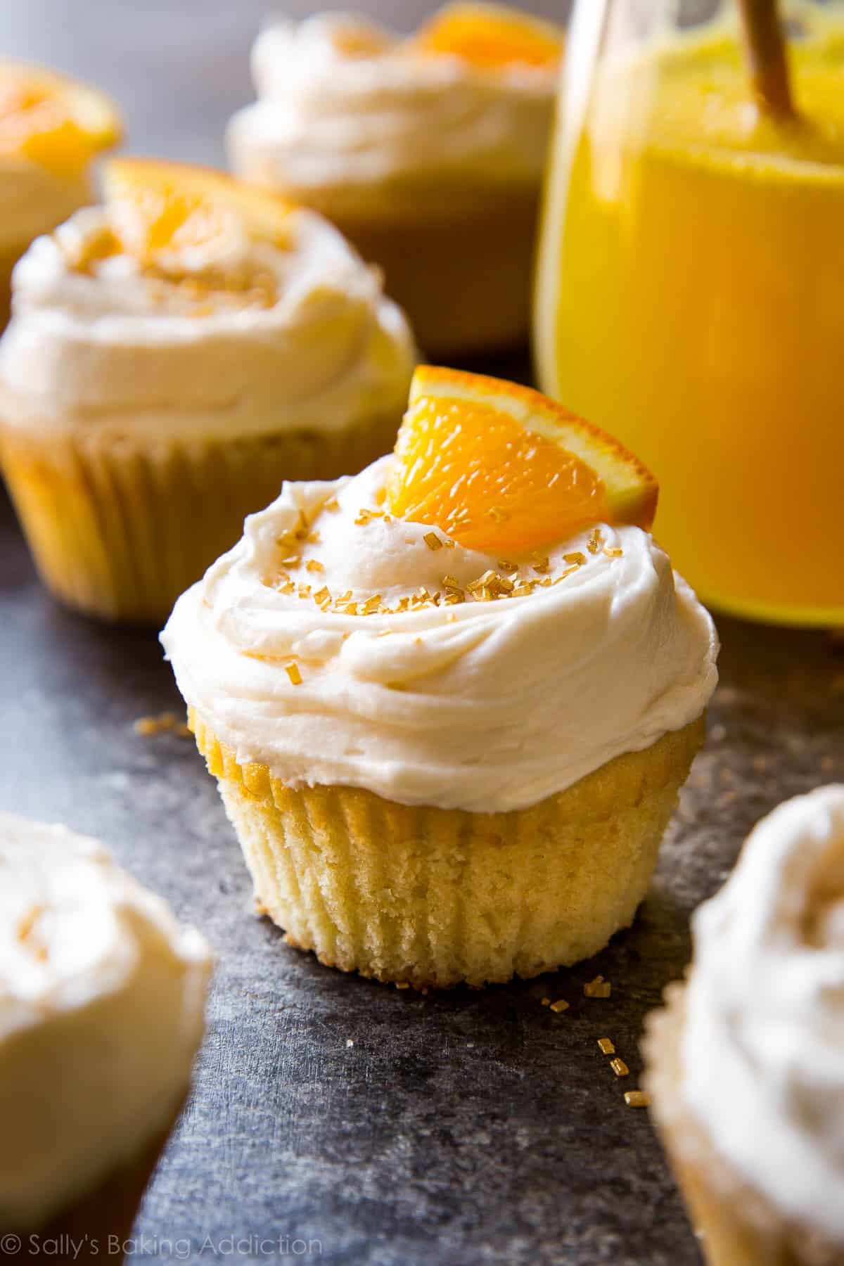 Decorate the mimosa cupcakes however you’d like. We simply swiped frosting on each cupcake with an icing knife, then topped with an orange slice and a shower of gold sprinkles. Because it’s a sparkling fresh-squeezed mimosa!