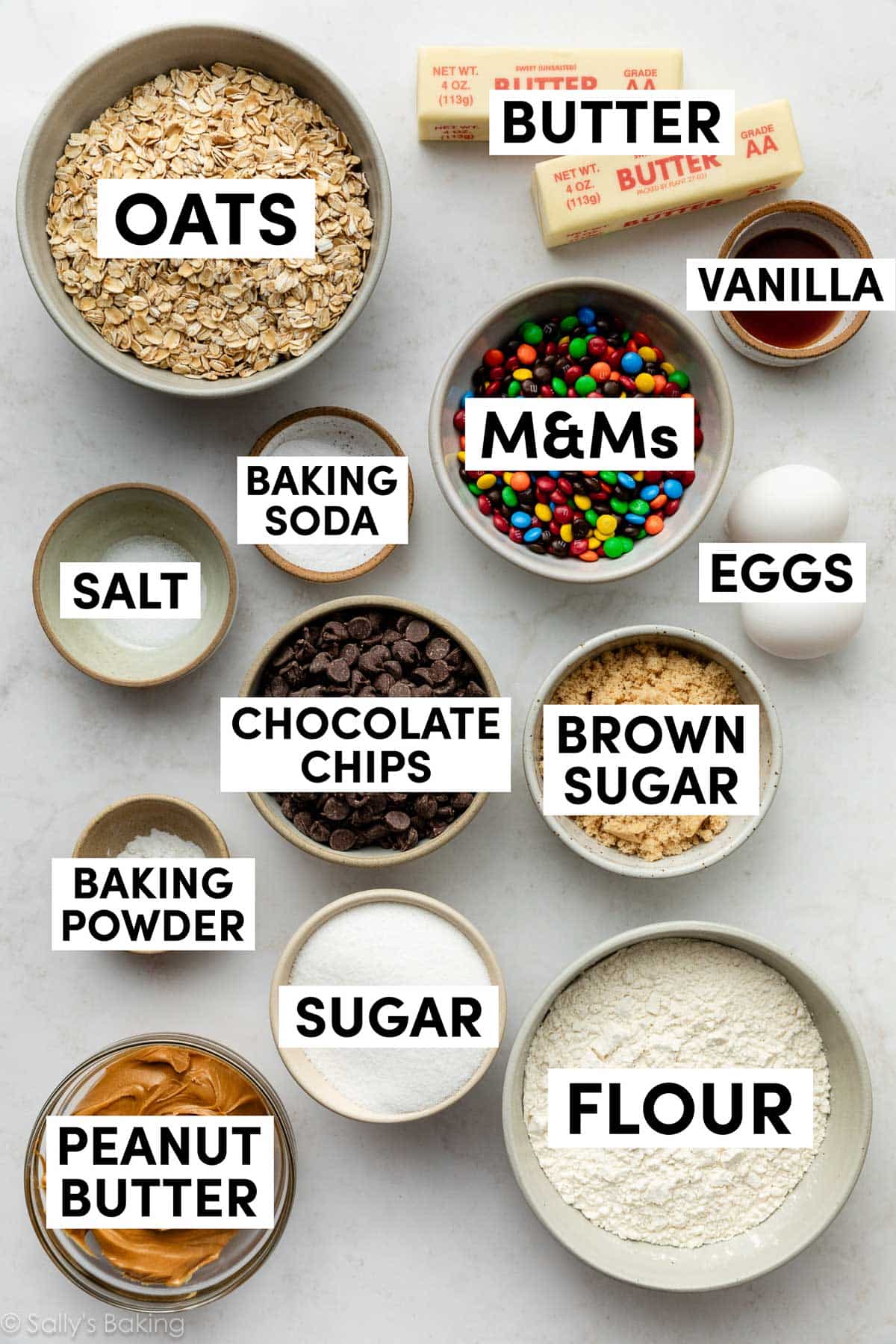 Monster cookies are peanut butter cookies packed with chewy oats, chocolate chips, and M&Ms. This recipe for big giant monster cookies yields 2 dozen extra-large cookies that are extra-perfect for cookie monsters who have a hard time choosing between oatmeal cookies, peanut butter cookies, and chocolate chip cookies!